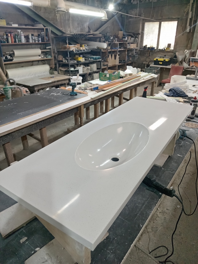 Мы специалисты с 2010 года в изготовлении столешниц с влитой раковиной из искусственного камня в ванную комнату.